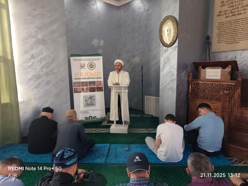 Еңбекші ауданы бойынша уақып істерінің жетешкісі Маметов Исматулла Әр-Рақиб мешітінің жамағатына Қазақстан мұсылмандары діни басқармасының атқарған уақып істеріне қатысты іс-шараларын баяндап, уақып жасаудың діндегі орнын насихаттады.